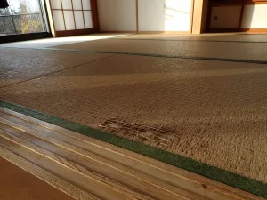 お伺いしたお客様宅で案内された和室が長年の使用から劣化が激しく更に猫の爪とぎで醜い状態でした。お客様が言うのには「畳くずが衣服に付いて困っちゃいます」と又新築時から畳表を交換するのが初めてと言いました。今回畳表替えとこれも同じく猫の爪とぎでボロボロ状態だった襖の張替えも行いました。ただ襖の張替えはクロス仕様を提案しました。クロスの種類にペット対応品の強化タイプがありますのでそのクロスで施工しました。