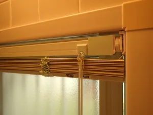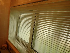 長年の使用に汚れが目立ち始めた浴室のブラインド、畳の打ち合わせでお伺いしたお客様の何気ない一言でブラインドの交換を行いました。「ブラインドって高いんでしょう」の一言から採寸お見積りへとそして交換作業へ。既存のブラインドの羽巾は15mm、今回は25mmの羽巾、操作する紐やポールは一体化され使いやすくなりました。